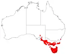Persoonia juniperina is found across Tasmania and from Green Cape on the New South Wales far south coast, south through Victoria and into southeastern South Australia as far west as Adelaide. The habitat is sclerophyll forest and heath to an altitude of 700 m (2,300 ft).[2][3][4]