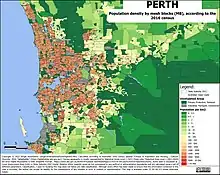 Perth's metropolitan area extends along the coast to Two Rocks in the north and Singleton to the south,[71] a distance of approximately 125 kilometres (80 mi).[72] From the coast in the west to Mundaring in the east is a distance of approximately 50 km (30 mi). The Perth metropolitan area covers 6,418 km2 (2,478 sq mi).[3] The built-up urban area of Perth is 1,722 km2 (665 sq mi), the same as Wuhan or Salt Lake City and slightly smaller than London, making Perth the 67th largest urban area in the world. Perth is also the 50th least densely populated out of the 990 urban areas in the world with a population above 500,000.[73]