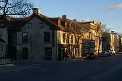 Erected in 1863, the Perth Town Hall stands out as one of the most impressive municipal buildings in Eastern Ontario. The two-storey structure with cupola-shaped clock tower is constructed from white or cream-coloured freestone (Potsdam sandstone). Throughout the years, the building has housed an auditorium, council chambers, post office, police headquarters, lock-up and municipal offices.[11] Perth's downtown area lies within a designated Heritage Conservation District.[12]