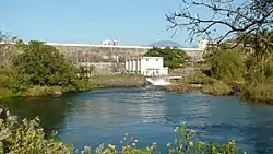 The dam was constructed between 1948 and 1953 by the then State of Travancore-Cochin.[5] The height of the straight gravity masonry dam above the deepest foundation is 36.27 m (119.0 ft), with Full Reservoir Level (FRL) at 93.3 m (306 ft), which is also the Maximum Water Level (MWL). The dam is 308 m (1,010 ft) long. The gross storage capacity of the reservoir is 818,400,000 m3 (2.890×1010 cu ft) at the FRL, which is also the effective storage capacity. The reservoir area is 9,620 ha (23,800 acres). The spillway, with its crest at 88.7 m (291 ft), is designed to pass a discharge of 894.91 m3 (31,603 cu ft) per second. There are four spillway gate openings, each 12.19 m × 4.57 m (40.0 ft × 15.0 ft) in size. The total volume of material content in the dam is 51,000 m3 (1,800,000 cu ft). The project lies in Seismic Zone-III.[7][3] The dam is provided with drainage gallery of 45.7 m (150 ft) length in the central section of the river. It serves the purpose of collecting seepage water from the foundation of the dam and also as an inspection gallery, and measures 1.52 m × 2.29 m (5 ft 0 in × 7 ft 6 in).[5]