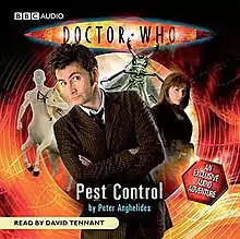 Pest Control is an exclusive to audio[1] Doctor Who story, produced as part of BBC Books' New Series Adventures line, and the first entry in the series to be produced. Written by author Peter Anghelides[2] and read by series star David Tennant,[1] it is also the first non-televised Doctor Who adventure to feature the companion Donna Noble[1][3] (the first standard printed books featuring her were released in autumn 2008). Pest Control was released on CD on 8 May 2008[1] and is also available for download.[2]