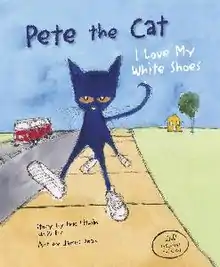 The first book, Pete the Cat: I Love My White Shoes, is the story of a cat named Pete whose white shoes become dirty after he steps in various substances, but "Pete never loses his cool."[1] Written as a song, its refrain is "I love my white shoes", changing to "I love my red shoes", "I love my blue shoes", and "I love my brown shoes". Then he steps in a bucket of water and the colors wash off, and they become wet, but still never loses his cool, he just sings his song.