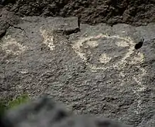 The basalt rocks' geologic nature allows for the creation of the petroglyphs, or rock carvings, on their surface. The rocks contain high concentrations of iron, manganese and calcium; this combination creates rocks of a gray-like color. However, over thousands of years of exposure to the desert's rough environment, a "desert varnish" forms on the surface. The varnish is formed from the oxidization, or rusting, of the manganese and iron when mixed with oxygen in the air and water from rain; this varnish is dark, almost-black and glossy in appearance. Long ago, Native Americans, as well as Spanish settlers discovered that images can be created on the faces of the rocks by chipping away at this layer using rocks and other tools.[7]