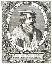 Petrus Apianus (April 16, 1495 – April 21, 1552),[1] also known as Peter Apian, Peter Bennewitz, and Peter Bienewitz, was a German humanist, known for his works in mathematics, astronomy and cartography.[2] His work on "cosmography", the field that dealt with the earth and its position in the universe, was presented in his most famous publications, Astronomicum Caesareum (1540) and Cosmographicus liber (1524). His books were extremely influential in his time, with the numerous editions in multiple languages being published until 1609. The lunar crater Apianus and asteroid 19139 Apian are named in his honour.[2]