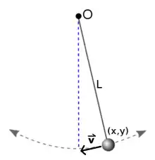 Consider a pendulum. Because of how the motion of the weight is constrained by the arm, the velocity vector of the weight must be perpendicular at all times to the position vector . Because these vectors are always orthogonal, their dot product must be zero. Both position and velocity of the mass can be defined in terms of an - coordinate system: