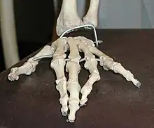 The phalanges are the bones that make up the fingers of the hand and the toes of the foot. There are 56 phalanges in the human body, with fourteen on each hand and foot. Three phalanges are present on each finger and toe, with the exception of the thumb and large toe, which possess only two. The middle and far phalanges of the fourth and fifth toes are often fused together (symphalangism).[1][2] The phalanges of the hand are commonly known as the finger bones. The phalanges of the foot differ from the hand in that they are often shorter and more compressed, especially in the proximal phalanges, those closest to the torso.[3]