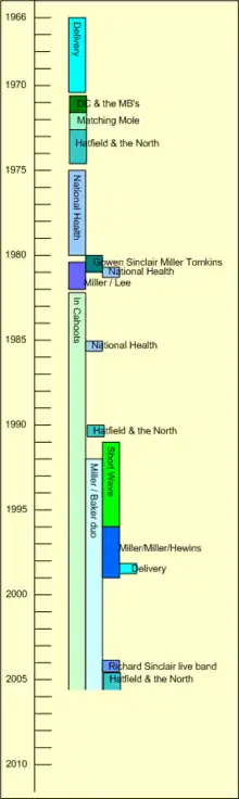 He was born in Barnet, Hertfordshire. Self-taught on guitar, Miller formed his first band, Delivery, at age 17, which backed blues musicians playing at Ronnie Scott's Jazz Club in London.[2] In the 1970s he was a founding member of Matching Mole, Hatfield and the North and National Health. In later years he was a member of Short Wave (with Hugh Hopper, Pip Pyle, and Didier Malherbe), and In Cahoots with Richard Sinclair, Elton Dean, Peter Lemer, and Pip Pyle.[3] In 2005 and 2006, Miller toured with a re-united Hatfield and the North. Miller also performed and recorded extensively in solo projects.