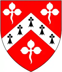 - Richard Mede (d.1491),[4] of Barrow Court in Tickenham,[1] son and heir, who married twice, firstly to Elizabeth Sharpe, daughter of John Sharpe,[5] and secondly to Anne Pauncefoot, daughter of Thomas Pauncefoot of Hasfield, in Gloucestershire. Anne survived her husband and remarried to Arthur Kemys. Richard's children all died young, and his heir was his sister Isabel Mede. Richard's monumental brass survives in the easternmost compartment of the "Mede Chantry" erected by his father (see below) in St. Mary Redcliffe Church, Bristol. It is an oblong plate, upon which are incised figures of a man kneeling opposite a kneeling woman with another woman standing behind him. He is of youthful appearance with smooth face and long flowing hair, and is clad in complete plate armour, over which he wears a tabard embroidered with the arms of Mede. He is without spurs and his helmet lies on the ground. His second wife kneeling opposite him wears a pedimental headdress with veil hanging down behind, necklace and girdle, and plain gown, over which is her mantle emblazoned with the arms of Pauncefoot: Gules, three lions rampant argent. The standing figure, Richard's first wife, is similarly clad, but without mantle. From the kneeling figures arise speech scrolls inscribed: from mouth of Richard: Sanct.. Trinitas un(us) de(us) miserere nobis "O Holy Trinity, one God, have pity on us"); Speech scroll from mouth of his wife: Pater de caelis, deus miserere nobis ("Father from Heaven, God have pity on us") addressed to the Holy Father, whose radiated demi-figure is engraved above, supported by a cloud (indicated by a line nebulée) with his hands raised in blessing.[1]