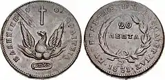 ![]() Silver one-phoenix coin, minted in Aegina by Count Ioannis Kapodistrias. Dated 1828. Obverse: phoenix rising from the ashes below a cross, symbol of the newly reborn Orthodox Christian Greek state, inscription 'ΕΛΛΗΝΙΚΗ ΠΟΛΙΤΕΙΑ' ('Hellenic State'). The letters αωκα represent 1821, the date of the Greek Declaration of Independence, in the Ancient Greek numeral system. The small anchor was the Aegina mint mark. Reverse: denomination '1 ΦΟΙΝΙΞ' ( '1 phoenix') inscription: 'ΚΥΒΕΡΝΗΤΗΣ Ι.Α. ΚΑΠΟΔΙΣΤΡΙΑΣ' ('Governor I.A. Kapodistrias') | |