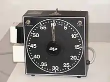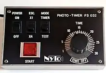 A photo-lab timer, photo interval timer, or darkroom timer is a device used in photography for timing the processes of enlarging negatives on paper,making them at any scale. It is a device to which the photo lab enlarger is attached to ensure that the duration of photo exposures on sensitive paper can be carried out accurately.When the selected time has elapsed, the enlarger is switched off or an alarm is sounded, for the photographer to turn it off.