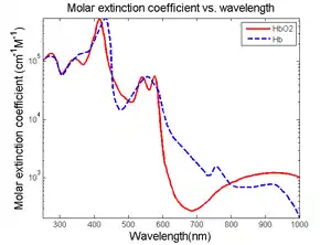Visible light absorbers (λ = 400 to 700 nm) include oxyhemoglobin, deoxyhemoglobin, melanin, and cytochrome c. Visible light photoacoustic microscopy is particularly useful in determining hemoglobin concentration and oxygen saturation due to the difference in absorption profiles of oxyhemoglobin and deoxyhemoglobin. Real-time analysis can then be used to determine blood flow speed and oxygen metabolism rate.[3] In addition, photoacoustic microscopy is capable of early melanoma detection due to the high concentration of melanin found in skin cancer cells.
