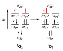 While many stable molecules’ HOMOs consist of bonding molecular orbitals and therefore require a moderate energy jump from bonding to antibonding to reach their first excited state, the antibonding nature of molecular oxygen’s HOMO allows for a lower energy gap between its ground state and first excited state. This makes excitation of O2 a less energetically restrictive process. In the first excited state of O2, a 22 kcal/mol energy increase from the ground state, both electrons in the antibonding orbitals occupy a degenerate π* orbital, and oxygen is now in a singlet state (indicated as 1O2).[3] 1O2 is very reactive with a lifetime between 10-100µs.[4]