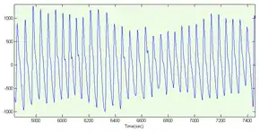 ![]() Representative PPG taken from an ear pulse oximeter. Variation in amplitude are from Respiratory Induced Variation. | |
