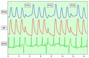 The height of AC component of the photoplethysmogram is proportional to the pulse pressure, the difference between the systolic and diastolic pressure in the arteries. As seen in the figure showing premature ventricular contractions (PVCs), the PPG pulse for the cardiac cycle with the PVC results in lower amplitude blood pressure and a PPG. Ventricular tachycardia and ventricular fibrillation can also be detected.[11]