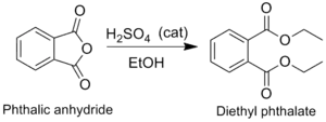 Phthalates are produced industrially by the acid catalysed reaction of phthalic anhydride with excess alcohol. The synthesis of diethyl phthalate is illustrative of this: