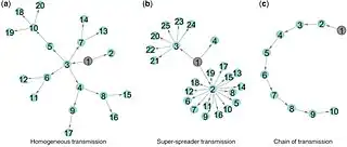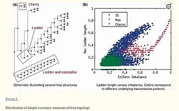 Different transmission networks result in quantitatively different tree shapes To determine whether tree shapes captured information about the underlying disease transmission patterns within an outbreak, we simulated evolution of a bacterial genome over three types of outbreak contact network—homogenous, super-spreading and chain—and summarized the resulting phylogenies with five metrics describing tree shape. Figure 2 and and33 illustrate the distributions of these metrics across the three types of outbreaks, revealing clear differences in tree topology depending on the underlying host contact network. Super-spreader networks gave rise to phylogenies with higher Colless imbalance, longer ladder patterns, lower Δw and deeper trees than transmission networks with a homogeneous distribution of contacts. Trees derived from chain-like networks were less variable, deeper, more imbalanced and narrower than the other trees. Other topological summary metrics considered did not resolve the three outbreak types as fully (Supplementary Information). Scatter plots can be used for pathogen transmission analysis to visualize the relationship between two variables, such as the number of infected individuals and the time since infection. For example, a scatter plot can be used to examine the relationship between the number of cases of a pathogen and the amount of time since the first case was reported. This can help to identify trends and patterns in the data, such as whether the spread of the pathogen is increasing or decreasing over time. Scatter plots can also be used to identify any outliers or clusters of data points, which can provide insight into potential transmission routes or super-spreader events. Overall, scatter plots can be a useful tool in pathogen transmission analysis to identify patterns and trends in the data, and to inform public health interventions and control measures.[84]