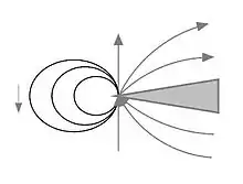 Whistles that generate sound through fluctuations of momentum or stress and strain of a force exerted on the surrounding medium are called dipole-like sources. The figure on the right is an example of a small rigid sphere that is moving back and forth in a given direction. This results in a non-uniform sound field. The sound power can be expressed as: