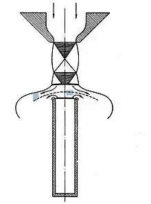 An annular duct carries the fluid that creates the annular jet. The jet impinges on a sharp ended ring with two toroidal cavities on either side. In Levavasseur's patent,[41] a structure is added downstream of the annular opening to act as a coupling horn to direct the sound. The sound generated is very intense. It appears that no scientific study has been done to elucidate the detailed feedback mechanisms of its operation, although it is clear that this whistle has class I feedback mechanism, similar to the police whistle.