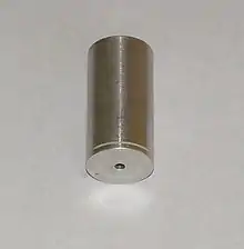 An example of this device is shown in the figure on the right; it had a 0.125 in (3.2 mm) diameter hole, was 1.9 in (48 mm) long, and 0.8 in (20 mm) in diameter. The quarter-wave resonance was calculated to be 1780 Hz, while the measured fundamental was 1625 Hz with detectable second and third harmonics. End corrections for radiation from the openings is needed to bring the two frequencies in consonance. To determine the end corrections, two additional dimensions are needed: the diameter d1 of the orifice and the diameter d2 of the tube.