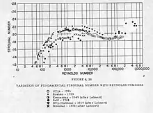 For many applications, the first equation below is often used. A review of the literature[23] produced the figure on the right for the Strouhal number. At low Reynolds numbers the Strouhal number rises as inertial effects begin to dominate and then decays slightly at higher numbers. The second equation below is a best fit for the data for 1000 < Re < 100000.