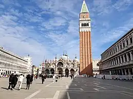 The square[2] is dominated at its eastern end by St Mark's Basilica. It is described here by a perambulation starting from the west front of the church (facing the length of the piazza) and proceeding to the right.
