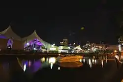 The venue opened in 1981 as a temporary structure known as the "Harbor Lights Concert Pavilion",[1] with a capacity of 3,133. In 1990, the City of Baltimore enlisted Future Tents Limited (now known as FTL Associates) to create a permanent structure. The $4.9 million renovation was completed in July 1991, now known as the "Pier Six Concert Pavilion", with an increased capacity of 4,341.[2] In 2004, the venue was briefly known as the "Cavalier Telephone Pavilion",[3] until the City restored its original name in 2006.[4]