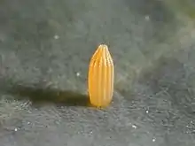 The small white will readily lay eggs on both cultivated and wild members of the cabbage family, such as charlock (Sinapis arvensis) and hedge mustard (Sisymbrium officinale). P. rapae is known to lay eggs singularly on the host plant. The egg is characterized by a yellowish color and 12 longitudinal ridges.[12] The egg production peaks about a week after adulthood in lab and the female can live up to 3 weeks. Females tend to lay fewer eggs on plants in clumps than on isolated plants.[7][13] It has been suggested that isothiocyanate compounds in the family Brassicaceae may have been evolved to reduce herbivory by caterpillars of the small white.[14] However, this suggestion is not generally accepted because the small white has later been shown to be immune to the isothiocyanate forming reaction due to a specific biochemical adaptation. In contrast, the small white and relatives seem to have evolved as a consequence of this biochemical adaptation to the isothiocyanate-forming glucosinolates.