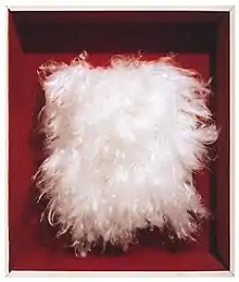 Manzoni's work changed irrevocably after visiting Yves Klein's exhibition 'Epoca Blu' at the Galleria Apollinaire in Milan, January 1957.[8] This exhibition consisted of 11 identical blue monochromes. By the end of the year he had ceased producing work influenced by the prevailing trends in Art Informel, to works that responded directly to Klein's monochromes.[9] Called Achromes, they invariably looked white but were actually colourless. In these paintings Manzoni experimented with various pigments and materials. Initially favouring canvases coated in gesso (1957–1958), he also worked with kaolin, another form of white clay often used in the production of porcelain.[10] The kaolin works are generally made from clay covered canvases folded horizontally, or sometimes cut-out squares of canvas coated in the clay and adhered onto the canvas; he created just nine large-scale relief paintings depicting folded cloth.[11] As well as Yves Klein, these works showed the influence of Lucio Fontana and Alberto Burri and the American artist Robert Rauschenberg, who had painted neutral white canvases in 1951.[12] Later he would create Achromes from white cotton wool, fiberglass, rabbit skin and bread rolls. He also experimented with phosphorescent paint and cobalt chloride so that the colours would change over time. In addition to these fabricated materials, the artist's own bodily products and features became art. In addition to his famous Artist's Shit (Merda d'artista), in which Manzoni's own excrement became a series of art objects, the use of fingerprints, blood, and breath also figured into his experimental body of work.[5]