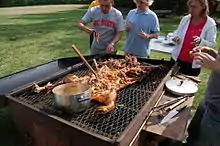 The pig pickin' is a significant part of the culture of the South; the necessary work and time needed to cook the hog makes it ideal for church gatherings ("dinner on the grounds") or family reunions, and they can be held virtually year-round thanks to the region's mild winters. Pig pickin's are popular among the most devoted tailgaters at college football games across the South. East Carolina University in Greenville North Carolina, famous for its football tailgating, has been holding an annual pig pickin' contest called the Pigskin Pig-Out since 1985.[8] The pig pickin' has been long associated with politics; many local political parties and politicians still use the pig pickin' to attract people to meetings and campaign rallies. In 1983, Rufus Edmisten, running for Governor of North Carolina at the time, was overheard saying "I've eaten enough barbecue. I am not going to eat any more. I'm taking my stand and that is it."[9]