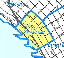 The Market is located roughly in the northwest corner of Seattle's central business district. To its north is Belltown. To its southwest are the central waterfront and Elliott Bay. Boundaries are diagonal to the compass since the street grid is roughly parallel to the Elliott Bay shoreline.[2][3][4]