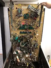 The introduction of microprocessors brought pinball into the realm of electronic gaming. The electromechanical relays and scoring reels that drove games in the 1950s and 1960s were replaced in the 1970s with circuit boards and digital displays. The first pinball machine using a microprocessor was Flicker, a prototype made by Bally in 1974. Bally soon followed that up with a solid-state version of Bow and Arrow in the same year with a microprocessor board that would be used in eight other machines until 1978, which included Eight Ball, the machine that held the sales record from 1977 to 1993.[9] The first solid-state pinball is believed by some to be Mirco Games' The Spirit of '76 (1976),[10] though the first mainstream solid-state game was Williams' Hot Tip (1977). This new technology led to a boom for Williams and Bally, who attracted more players with games featuring more complex rules, digital sound effects, and speech.