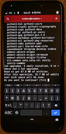 The PinePhone relies completely on open-source operating systems developed by external communities, with only the flashing onto the phone done by Pine64 directly.[40] Because these community OS projects were involved in the development of the PinePhone, it has been ported to 19 Linux distributions and seven graphical user interfaces, as of August 2021,[41] such as Ubuntu Touch by UBports, postmarketOS, Mobian (Debian ARM), LuneOS, Nemo Mobile and Maemo Leste.