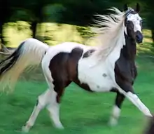 The Pintabian horse is an American part-Arabian horse breed. It has over 99% Arabian blood, but also exhibits the tobiano color pattern, which is not found in purebred Arabians.[1] The registry began using the term "Pintabian" in 1992 and trademarked the word in 1995.[2] which is the official registering authority for Pintabian horses worldwide.[3]