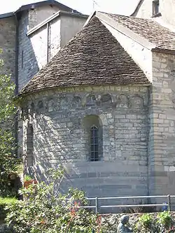 The abbey is in Lombard Gothic style, with French influences. The church has a single nave, measuring 20 x c. 8 m; the current edifice dates mostly from the 12th century reconstruction. The bell tower dates from the 18th century. A previous one, with an octagonal plan, was located on the other side of the church.