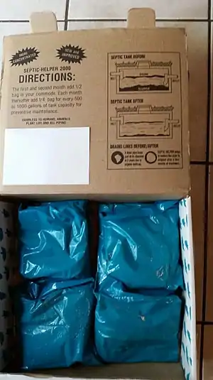 Pit additives are advocated for use in sanitation systems like pit latrines and septic tanks. Additives consist of packages of micro-organisms or enzymes or both. More than 1,200 septic system additives were estimated to be available in the U.S. in 2011.[3] However, very little peer-reviewed and replicated field research exists to confirm the efficacy of biological additives.[3]