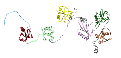 Plasma Gelsolin is a 755 AA, 83 kDa plasma protein made up of six "gelsolin domains," each composed of a 5-6 strand β-sheet between one long and one short α-helix.[15] It exhibits a weak homology between domains S1 and S4, S2 and S5, and S3 and S6, and is identical to the cytoplasmic form of the protein except for the addition of a 24 AA N-terminal extension. Additionally a 27 AA N-terminal signal peptide is cleaved prior to pGSN's secretion from the cell. Both forms of the protein are encoded by highly conserved genes on chromosome 9 in humans, but are under the control of different promoters.[11] There is a single disulfide bond formed on the second domain of the plasma protein,[15] there are no documented natural post-translational modifications, and the pI ≈ 6.[16][17]