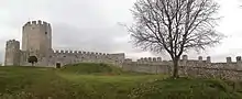 The Platamon Castle (Greek: Κάστρο του Πλαταμώνα), an important part of the history of Pieria, is a Crusader castle (built between 1204 and 1222) in Macedonia, Greece and is located southeast of Mount Olympus, in a strategic position which controls the exit of the Tempe valley, through which passes the main road connecting Macedonia with Thessaly and southern Greece.[1] The tower (donjon), which overlooks the highway, is an imposing medieval fortress.