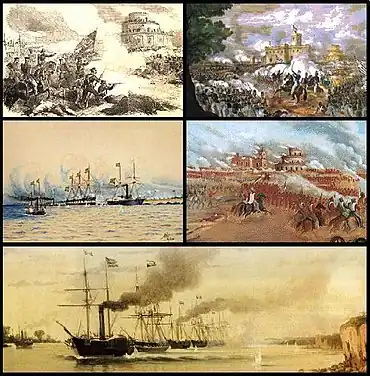 ![]() From top to bottom: Brazilian 1st Division in the Battle of Caseros; Uruguayan infantry aiding Entre Ríos cavalry in Caseros; Beginning of the Battle of the Tonelero Pass; Charge of Urquiza's cavalry in Caseros; Passage of Brazilian fleet at the Tonelero. | |||||||