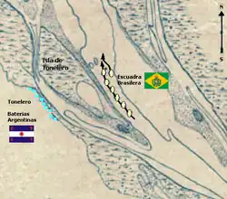 On 17 December 1851, a squadron of Brazilian ships, consisting of four steamships, three corvettes and one brig under the command of Grenfell, forced a passage of the Paraná River in the battle which became known as the Passage of the Tonelero. The Argentines had formed a powerful defensive line at The Tonelero Pass, near the cliffs of Acevedo, protected by 16 pieces of artillery and 2,000 riflemen under the command of general Lucio Norberto Mansilla.[67] The Argentine troops exchanged fire with the Brazilian warships but were unable to prevent them from progressing upriver.[69] The following day, the Brazilian ships returned and broke their way through the Tonelero's defences, carrying the remaining troops of Marques de Sousa's Brazilian division upstream towards Gualeguaichu. This second influx of ships caused Mansilla and his soldiers to withdraw in chaos, abandoning their artillery, believing that the Allies were intending to land and attack their positions from the rear.[70]