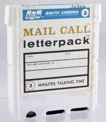 In 1967, Smith Corona (SCM) used the PlayTape cartridge format for the Mail Call,[9] a device which contained the PlayTape drive. Its design resembled a telephone and used blank tape PlayTape cartridges, offered with capacities of 3, 6 and 10 minutes of recording time, to be sent as voice letters with inexpensive shipping cost. The ends of the tape loop were fixed by an adhesive tape with a conductive top to prevent overwriting the same recording.