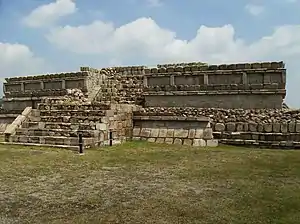 The complex had several expansions, to the north by a square patio at the west side and to the south by a rectangular patio at the eastern end, communicated by a hall way parallel to the basement. This expansion communicates with the exterior by four stairways. To the south, because of the terrain level contour, the expansion forms a large terrace similar to the northern expansion, and on the center of the south side has a stairway that leads onto the road that connects with the ballgame court.[3]