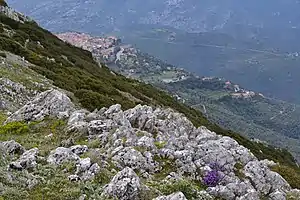 The Pleistos valley is not much of a rift valley. The rift is relatively recent, the separation is slight, and a scarp is still visible all the way from Amphissa to the head of the valley.[11] It is not unmitigated, however. There are few places where the climber might have to ascend a thousand-foot cliff. Most of the scarp has been subject to extensive rockfalls and landslides, which have created a slope of scree up to about 50% of the scarp. The scree extends over the entire valley floor up to the Pleistos ravine. Slopes vary from very slight to up to 60°. The bare scarp varies from 60° to 90° and beyond, if there is an overhang. In general, the scree is on the footwall of the fault, but erosion has produced some overhangs.