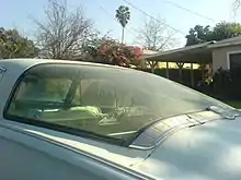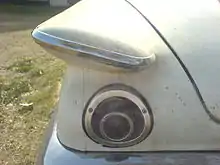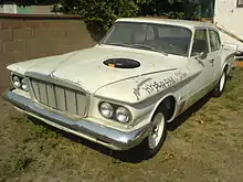 The Valiant was less radical in configuration than General Motors' compact Chevrolet Corvair, which had an air-cooled rear-mounted engine, but was considered more aesthetically daring than the also-new Falcon and Studebaker Lark compacts, which had more conventional looks; the Valiant boasted a radical design that continued Exner's "Forward Look" styling with "sleek, crisp lines which flow forward in a dart or wedge shape".[7] The flush-sided appearance was a carried-over feature from Chrysler's Ghia-built D'Elegance and Adventure concept cars which also gave the Valiant additional inches of interior room.[7] The Valiant's styling was new, yet with specific design elements that tied it to other contemporary Chrysler products, such as the canted tailfins tipped with cat's-eye shaped tail lamps and the simulated Continental spare tire pressed into the trunk lid that were thematically similar to those on the Imperial and the 300F. According to Exner, the stamped wheel design was used not only to establish identity with other Chryslers, but to "dress up the rear deck area without detracting from the look of directed forward motion".[7]