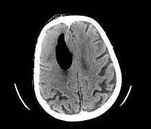 CT scans of patients with a tension pneumocephalus typically show air that compresses the frontal lobes of the brain, which results in a tented appearance of the brain in the skull known as the Mount Fuji sign.[1][2][3] The name is derived from the resemblance of the brain to Mount Fuji in Japan, a volcano known for its symmetrical cone. In typical cases, there is a symmetrical depression near the midline (such as the crater of a volcano), due to intact bridging veins.[3] Its occurrence seems to be limited to tension pneumocephalus (not occurring in pneumocephalus without tension).[4] The sign was first described by a team of Japanese neurosurgeons.[5]