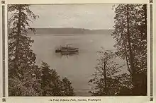 Point Defiance Park began as a military reservation after the Wilkes Expedition visited Puget Sound in the 1840s to map the bays and estuaries. Wilkes is thought to have said that with a fort positioned at the point, and at Gig Harbor across the narrows, one could "defy" the world.[2] The high cliffs and prominent location were never used for military operations. In 1888, President Grover Cleveland authorized its use as a public park. By 1890, streetcars brought visitors to wander among the gardens. In 1903, a waterfront pavilion was completed. By 1907 a seaside resort designed by Frederick Heath offered heated saltwater bathing in a pavilion called the Nereides Baths located on a bluff above the boathouse.