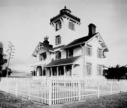 The lighthouse was built in 1874 with lumber from California redwoods.[2] It was designed by Paul J. Pelz who also designed Point Fermin's sister stations, East Brother Island Light in Richmond, California, Mare Island Light, in Carquinez Strait, California (demolished in the 1930s), Point Hueneme Light in California (replaced in 1940), Hereford Inlet Light in North Wildwood, New Jersey, and Point Adams Light in Washington State (burned down by the Lighthouse Service in 1912), all in essentially the same style. In 1941, the light was extinguished due to the bombing of Pearl Harbor. There was fear that the light would serve as a beacon for enemy planes and ships.[2] The original fourth order Fresnel lens was removed in 1942. The lighthouse was saved from demolition in 1972 and added to the National Register of Historic Places.[3] The light fell into disuse and disrepair and the lantern room and gallery were removed. The site was refurbished in 1974 including a new lantern room and gallery were built by local preservationists in 1974.[2] A wood replica lantern was also installed.
