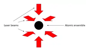 The atomic temperature can be measured using the time of flight (ToF) technique. In this technique, the laser beams are suddenly turned off and the atomic ensemble is allowed to expand. After a set time delay t, a probe beam is turned on to image the ensemble and obtain the spatial extent of the ensemble at time t. By imaging the ensemble at several time delays, the rate of expansion is found. By measuring the rate of expansion of the ensemble the velocity distribution is measured and from this, the temperature is inferred.[1][9]