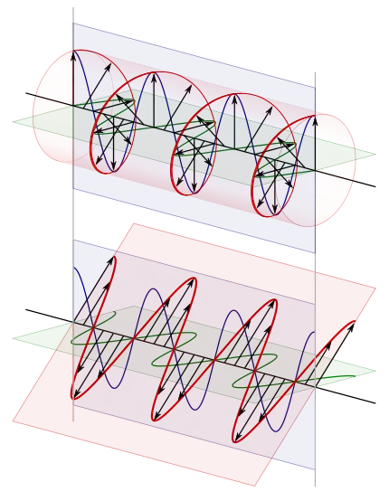 The top image is left-handed/counter-clockwise circularly polarized, as viewed from the receiver.[11] The bottom image is that of linearly polarized light. The blue and green curves are projections of the red lines on the vertical and horizontal planes respectively.
