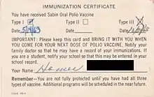 Once Sabin's oral vaccine became widely available, it supplanted Salk's injected vaccine, which had been tarnished in the public's opinion by the Cutter incident of 1955, in which Salk vaccines improperly prepared by one company resulted in several children dying or becoming paralyzed.[73]
