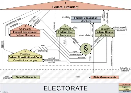 All federal laws must be signed by the president before they can come into effect. The president does not have formal a veto, but the conditions for refusing to sign a law on the basis of unconstitutionality are the subject of debate.[19] The office is currently held by Frank-Walter Steinmeier (since 2017).